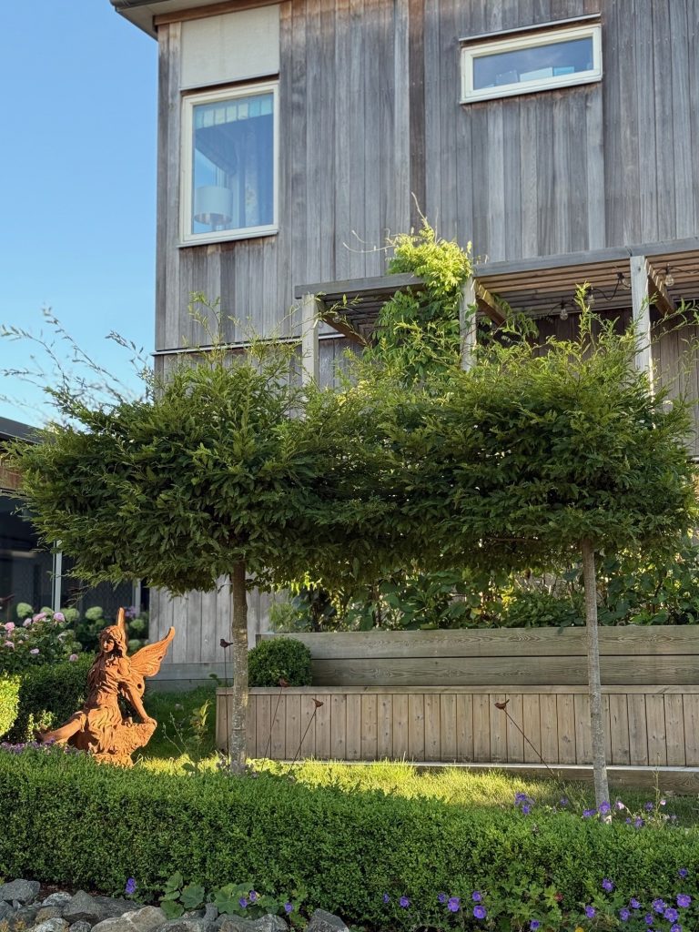 Jag hade sett vid en av våra resor en trädgår där man hade uppstammad Avenbok och jag blev kär, och bestämde mig genast att genom research söka var jag kunde få tag på dessa träd. Jag hittade dom i en Handelsträdgård i Halland i rätt höjd och storlek. Problemet var bara att dom hade två träd, och inte som jag hade planerat på min skiss som ni ser ovan där jag valt 3 stycken. Det är hela skälet till att det blev två, men saken är den att det blev superbra så i bland får man anpassa sig efter vad som finns! I dag är dom precis så fina som jag hade tänkt mig, och jag låter dom växa ihop för att bli som ett enda stort rektangelt parasoll! Jag är så nöjd och blir glad varje enskild dag när jag går ut genom dörren och titta på dom.