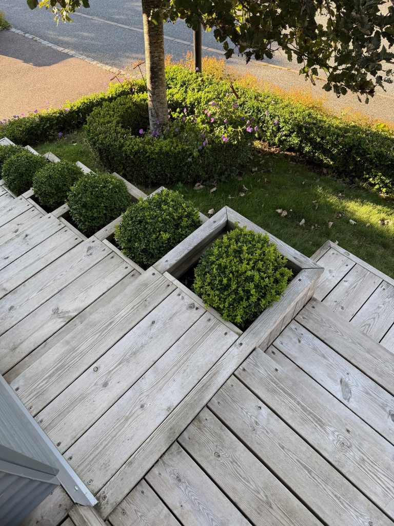 På framsidan byggde vi även ut en större terras och med tillhörande planteringslådor och pergola för att bygga bort den lutningen som tidigare fanns på vår tomt. Vi är så nöjda med resultatet och än i dag beundrar vi själva det vi faktiskt planerade, ritade och byggde. Allt på egen hand.