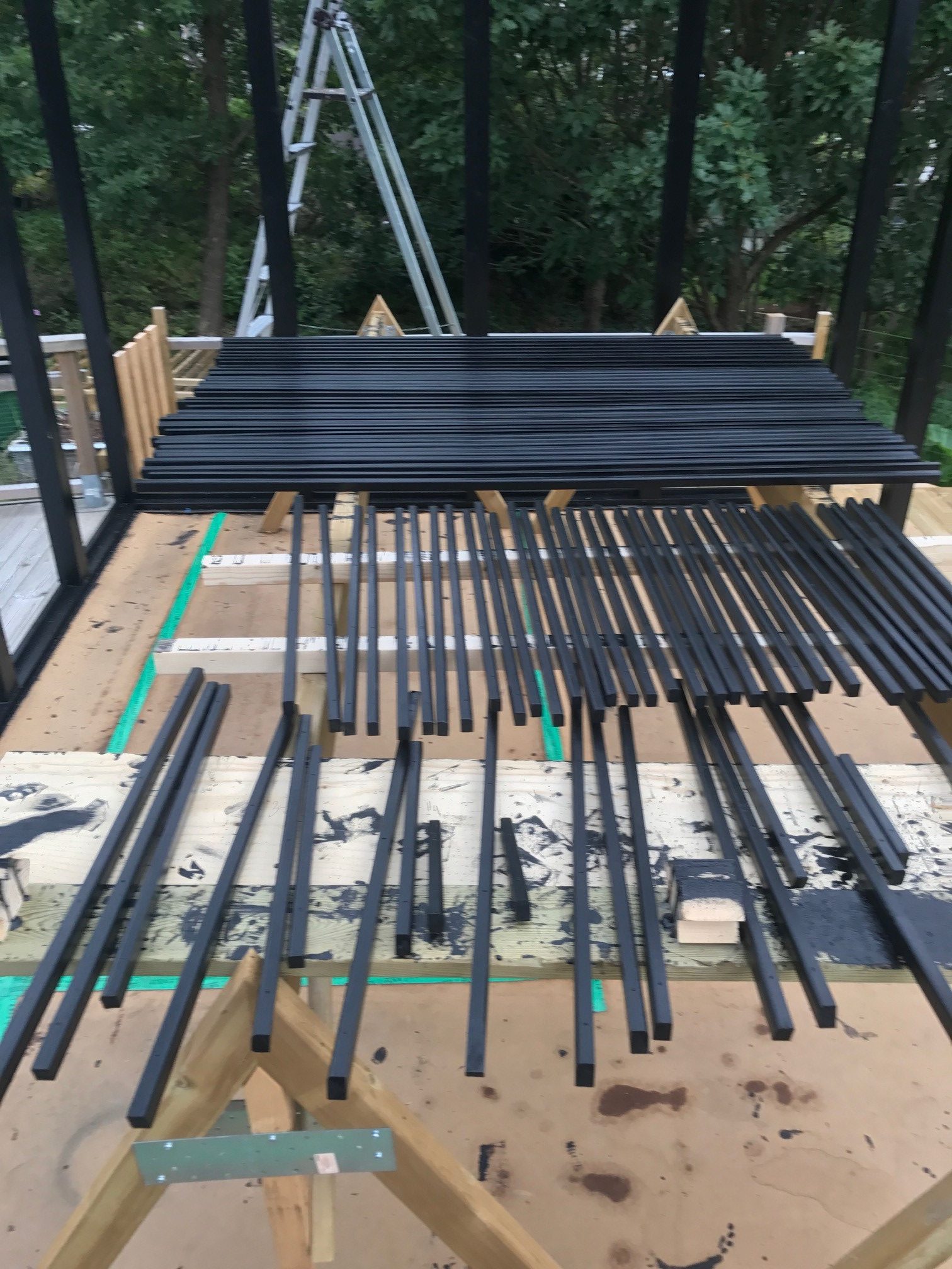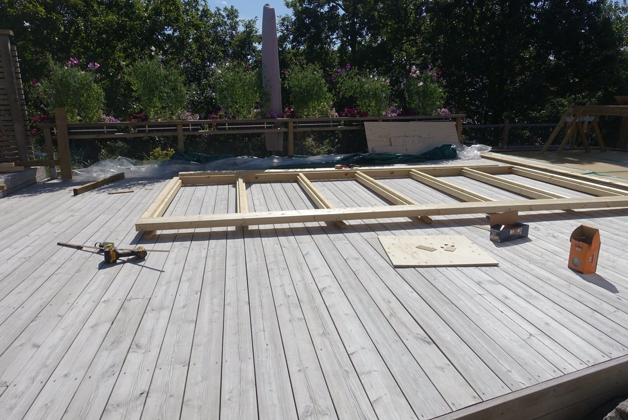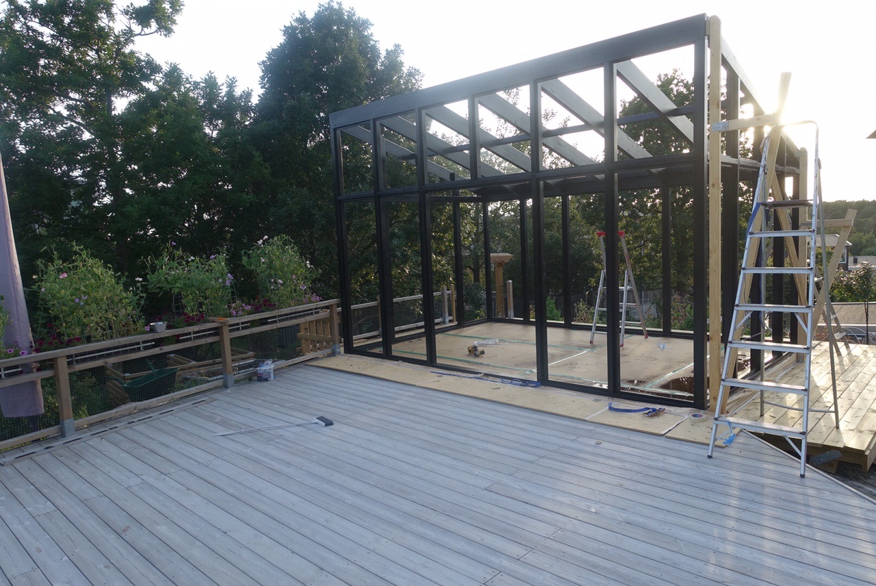 Sedan började Stefan bygga en ställning för att vi skulle kunna lägga glasen på taket på plats. 🙂