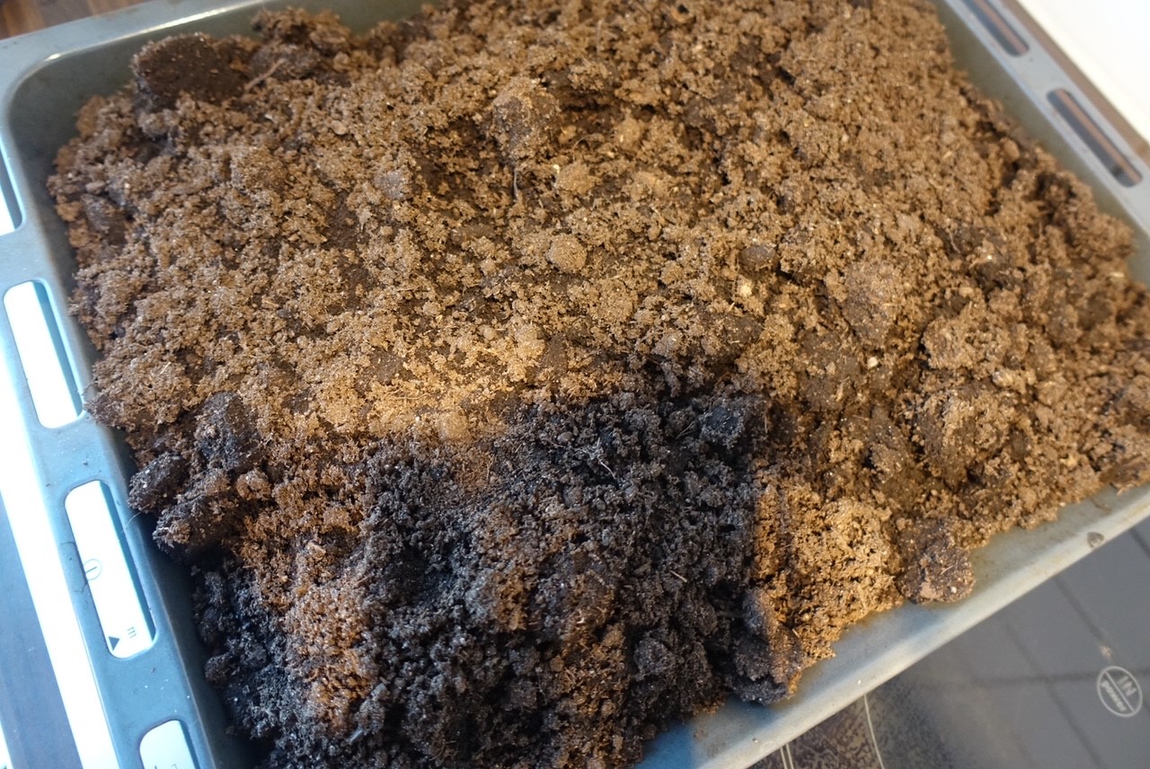 Sätt ugnen på 130 grader. Bred ut ett jämt lager jord i en långpanna och sätt in i ugnen i 45 minuter. Därefter tar man ut den och låter den svalna lite innan man fyller krukor med jord och slutligen frön!