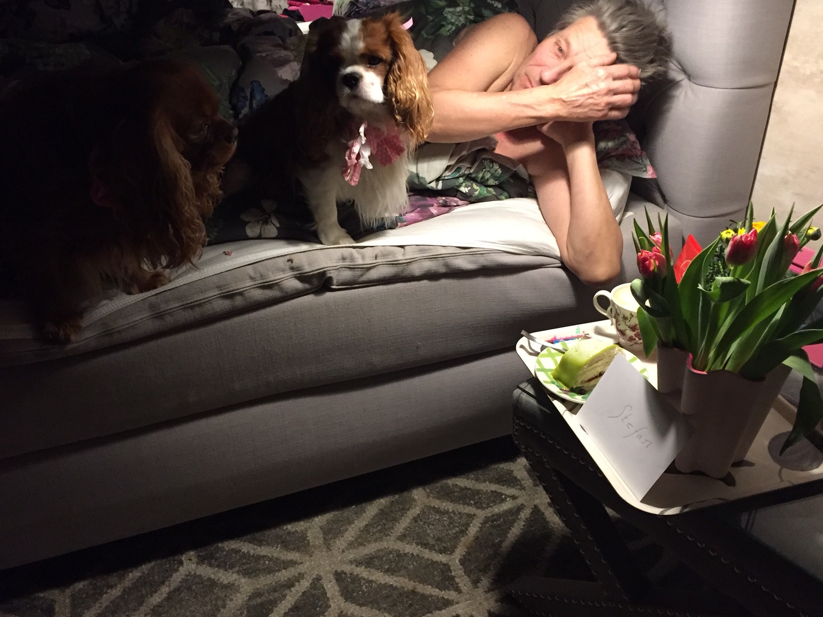 I dag var det upp med tuppen! Stefan fyller nämligen år i dag så jag och vovvarna gick upp klockan 05:00 i morse. Gjorde ordning tårta, kokade kaffe. Band rosetter runt halsen på vovvarna. Fixade blommorna fina på brickan och gick sedan upp och sjöng för honom tidigt i morse.