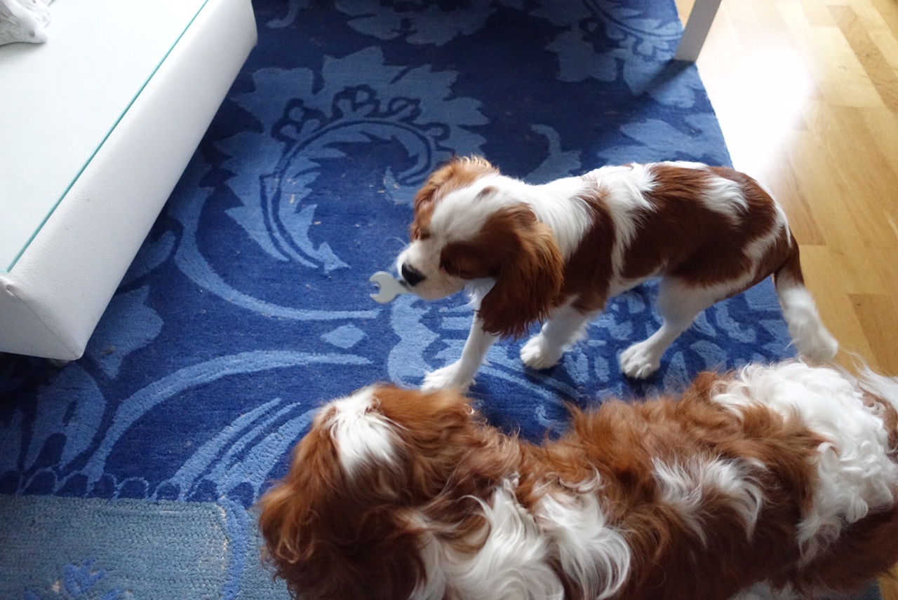 I går skulle Stefan bygga ihop en liten vagn som vi varit och köpt egna hjul till då de som hörde till inte var tillräckligt bra. Självklart skulle Boss vara med och montera. Han är nämligen expert!
