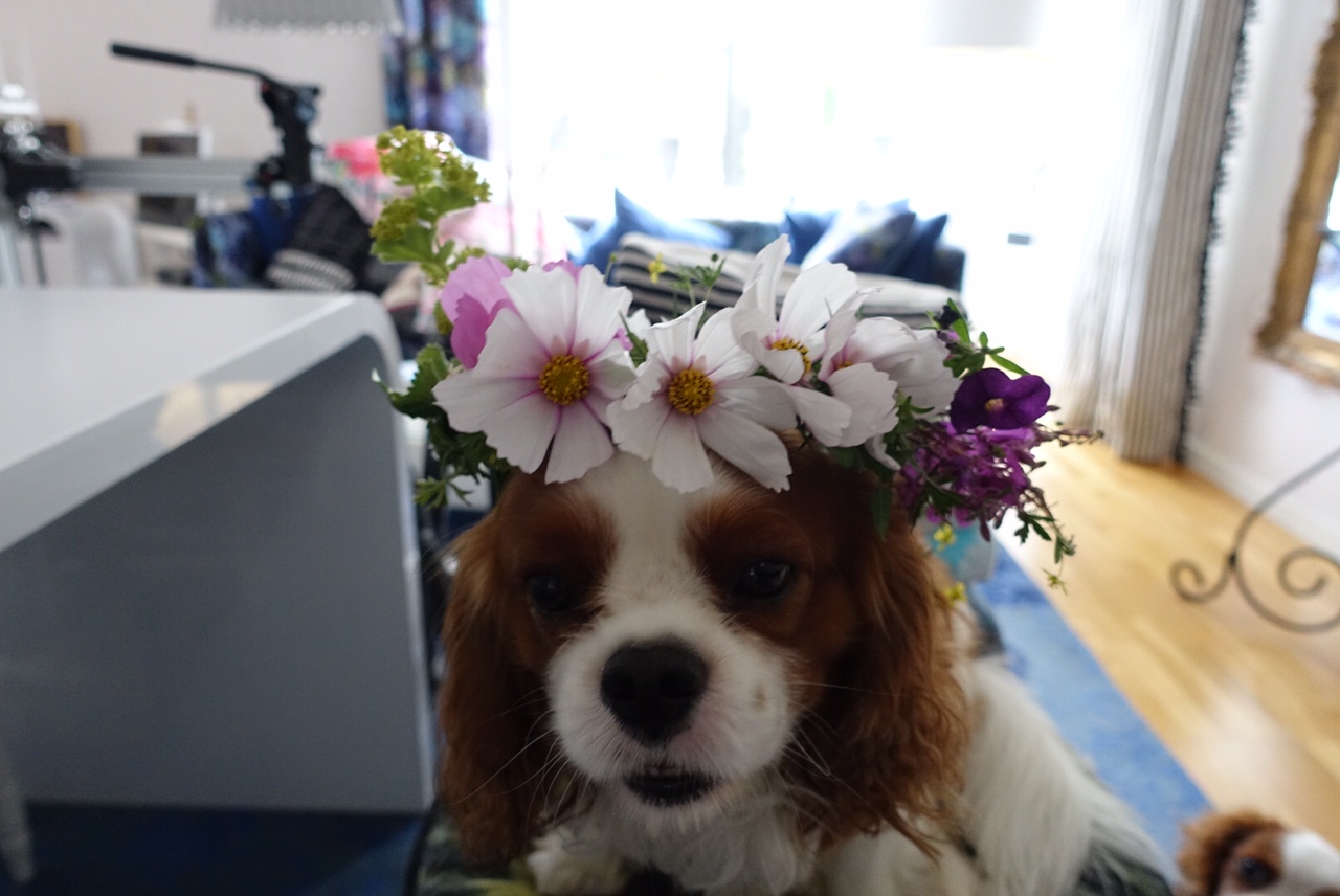 När Boss inte vill ha midsommarkrans på huvudet så gjorde jag så den passade runt halsen i stället. Det gick bra, men lite senare på dagen så var han villig att ha krans när han såg att Fonzen gick med på det! Skam den som ger sig, allting är lite otäckt i början och det var mest det. Boss är lite rolig med det för han reagerar på varje ”nytt ljud” högt eller inte, men han måste undersöka vad allting är. Första gången när mopedgänget åkte förbi så blev han lite rädd och undrade, nu reagerar han inte länge!
