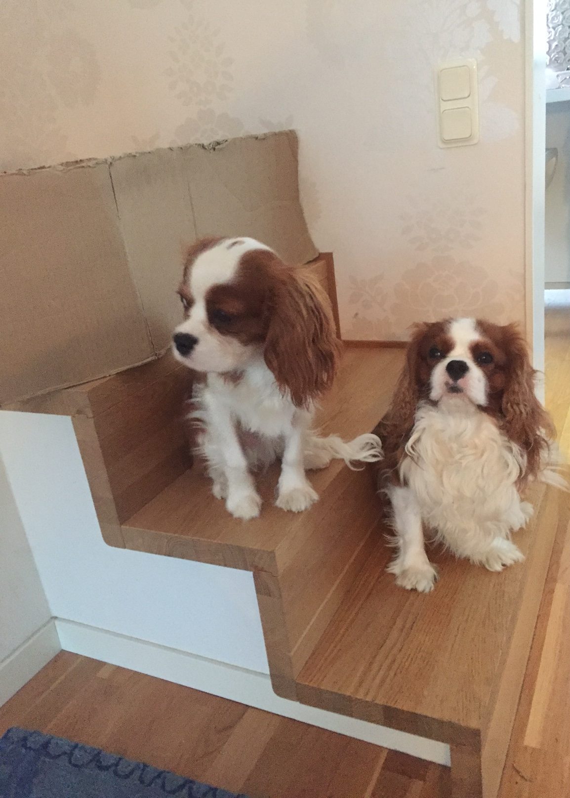 Sedan ville hundarna efter ett par timmar absolut väcka Stefan, men det roliga var att de satt i trappan och snick/snackade med varandra. Kanske la dom upp en plan.