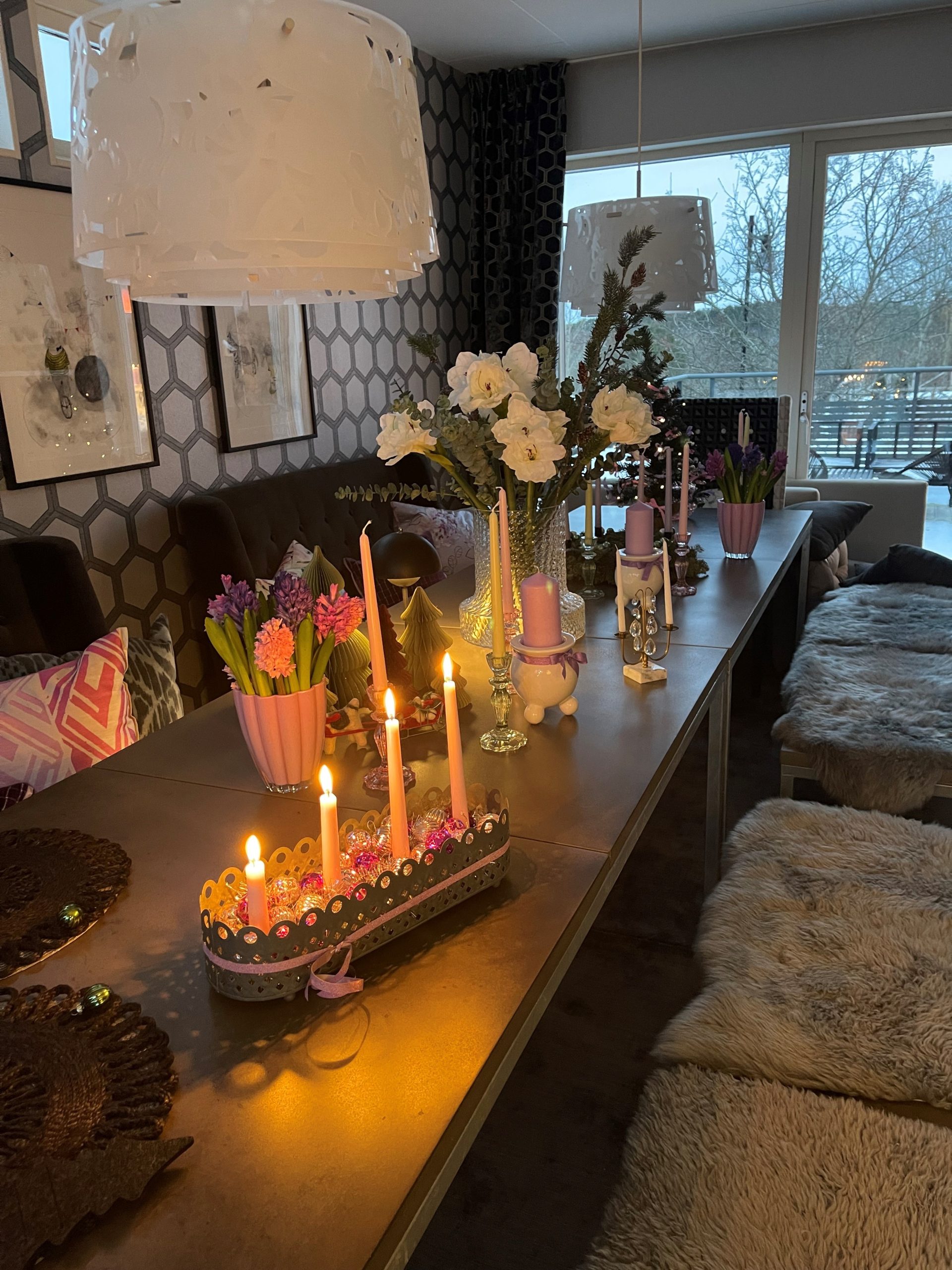 Jag har pyntat matsalsbordet med två vaser med snitthyacinter i tre olika färger. Min vas från Skrufs glasbruk med blommor, tallris och lite Eukalyptus. I köksfönstret har jag en rosa Azalea som har slagit ut så vackert lagom tills i dag. Jag har dekorerat bordet i en uppsjö av levande ljus! Allt för känslan!