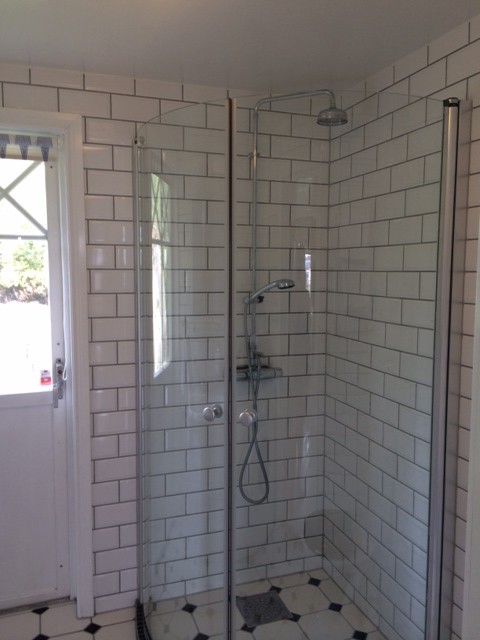 Dusch med glasade väggar och det är Stefan som gjort precis allting, från att ha satt väggarna till badrummet, dragit el, kalkat, lagt värme i golven, monterat handduks-tork, monterat alla möbler, ja han har helt enkelt gjort rubbet. Uppe på vinden liggs en 100 liters varmvattenberedare! På så sätt slapp vi att ha den i vårt badrum för sommarstugan är väldigt liten. Vi fick till och med plats med en tvättmaskin som bara är 40 djup men ändå har en 5 kg trumma. Perfekt, kan inte bli mer praktiskt och det känns lyxigt att ha två ställen med alla bekvämligheter på! Nu har han alltså även kopplat in vårt nya kommunala vatten och avlopp som sätts på för första gången i dag kl 20:00 och vi är färdiga med allt. Till och med diskmaskinen står på plats i köket! LYX!!