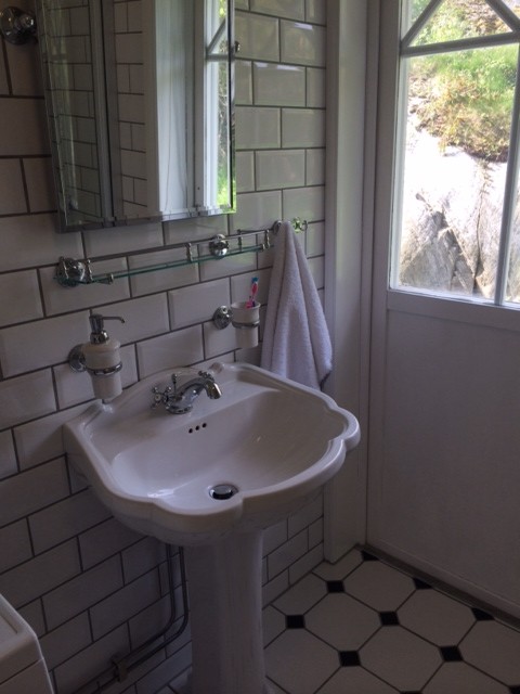 Lampan jag köpte till mitt fina badrum i sommarstugan passar tyvärr ej då vi redan satt upp en lampa som har skruvhål som i så fall skulle hamna utanför, så nu funderar jag på om den ska få vara på mitt arbetsrum eller på min lilla toalett hemma! Vi får se vad som blir bäst! Så här ser det ut i mitt badrum just nu!