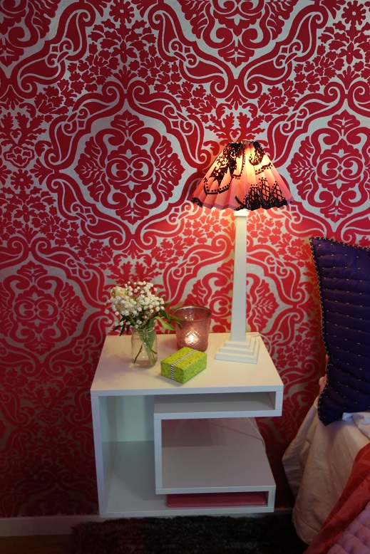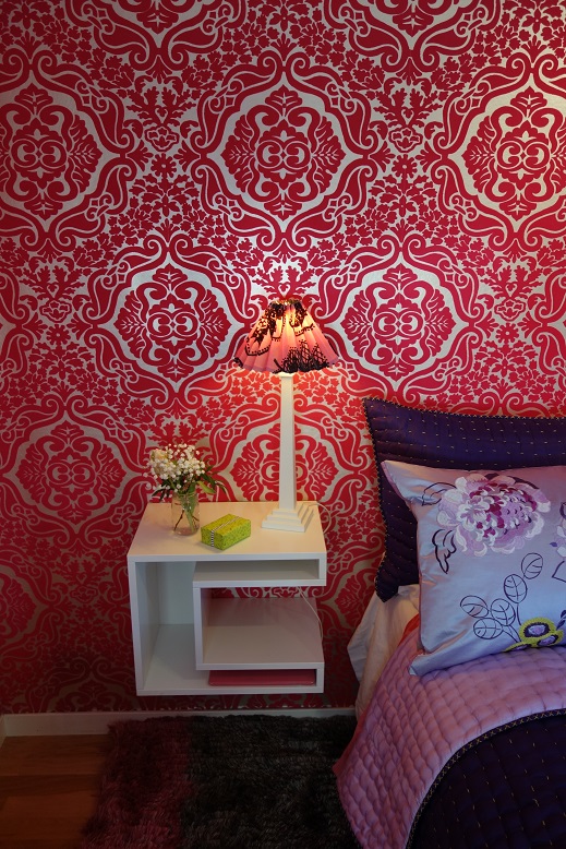 Sängborden jag har sitter fast på väggen. Dels för att få ett lättstädat hem, men även för att ha lite enklare möbler då det mesta i sovrummet är ganska ”överdådigt” så behöver man tona ner och förenkla andra delar. Ren design i kontrasterande färger emot tapeten gör underverk.