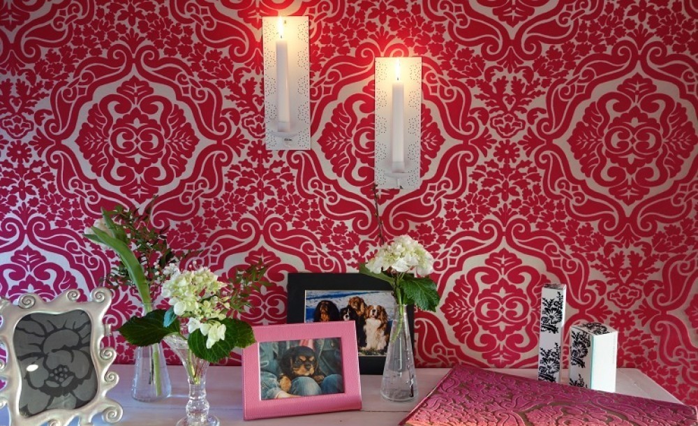 Alla väggar utom den lilla väggen där ett av mina 4 fönster sitter har samma tapet. Det är en tapet i rosa med silverbotten. Riktigt underbar om du frågar mig, men gaska extrem.