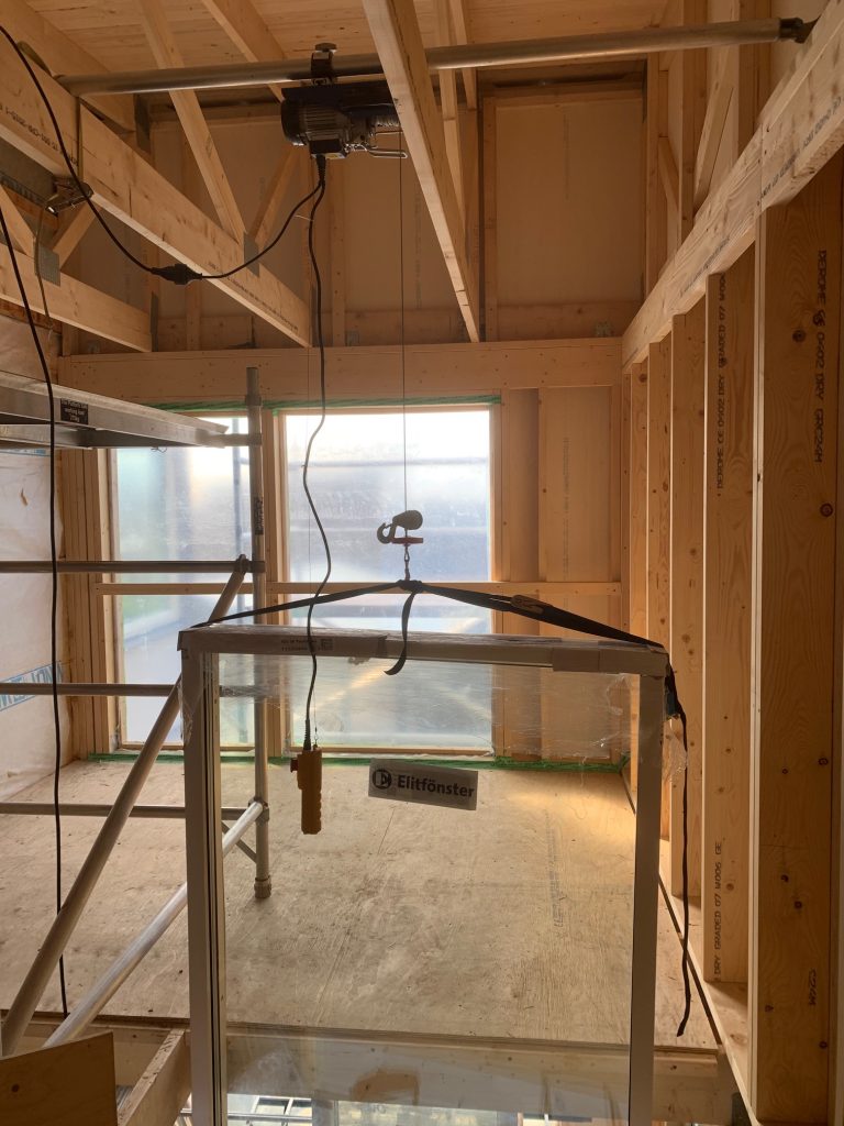 När man bygger hus så måste man tänka på precis allt i minstadetalj. Som hur man kan få upp fönstren till våning två. Stefan köpte tidigare en vinsch som hjälper till med allt tung som skall upp, och det blev även lösningen på att få upp fönstren i min walk-in-closet!