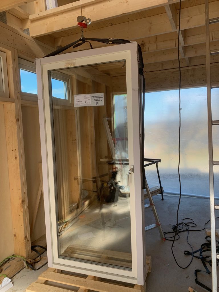 Nu är både balkongdörr och fönster på plats på våning två. Så roligt att se alla framsteg vi gör! Ni ser på bilden nedan att Stefan har monterat vinschen i takstolarna!