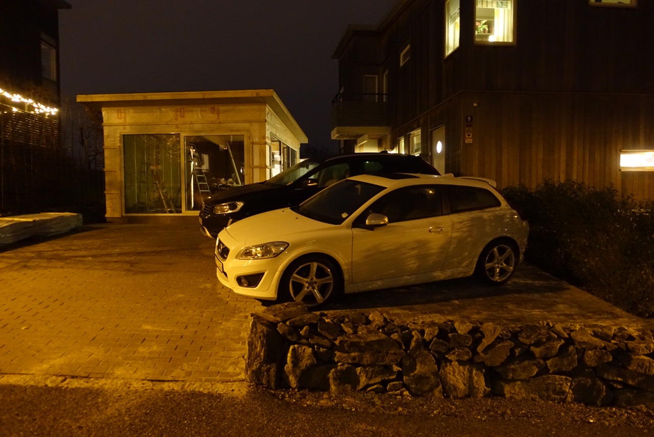 Nu pågår arbetet förfullt att färdigställa insidan och vi väntar på ”rätt” panel till utsidan då de levererat fel. Det skall vara cederträ som på huset men det skall vara exakt samma så klart så att det blir lika.