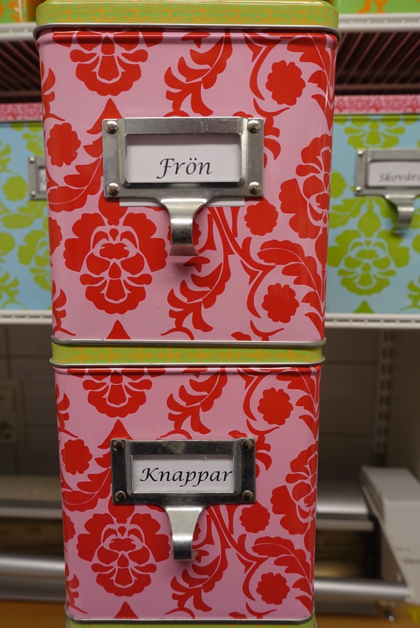 Hur gör man sin förvaring lite roligare? Jag tänkte därför visa en liten repris av mina förvaringar jag har i tvättstugan som jag har gjort för flera år sedan. Jag köpte mig ett gäng med fina plåtlådor med roliga mönster på. Man kan ofta köpa dom i set om tre. Då får man tre olika lådor med olika mönster och i 3 olika storlekar. Perfekt!