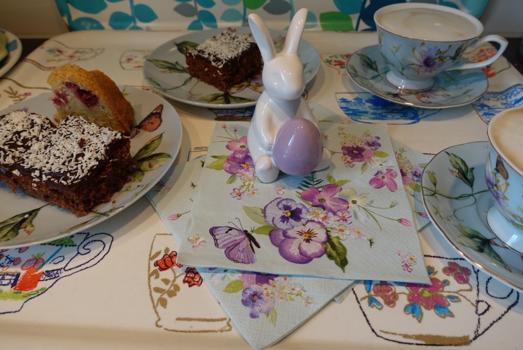 Redo för fika! Ser ni den fina påskharen jag köpte igår. Den inhandlades på Plantagen när jag var där och köpte fiberdukar! 🙂