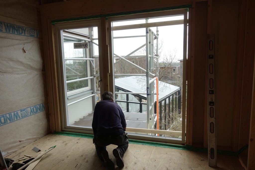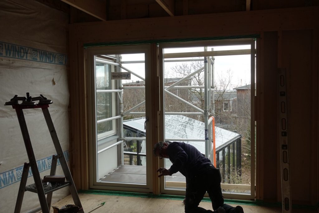 Fönster väger väldigt mycket och Stefan har vinschat upp dom till våning två. Sedan har han förberett allt för själva monteringen, och idag har en granne hjälpt oss att lyfta dom på plats. Efter 10 minuters jobb så var det klart.