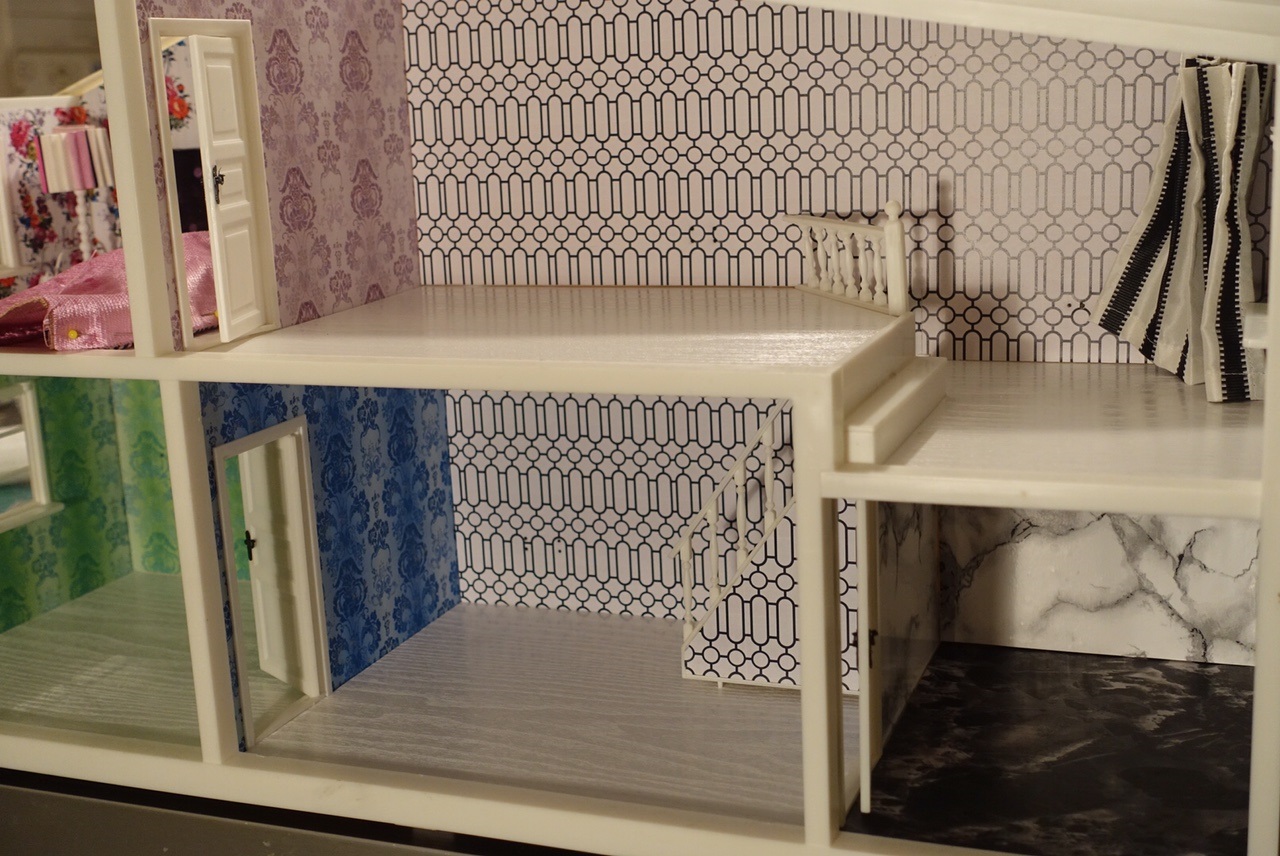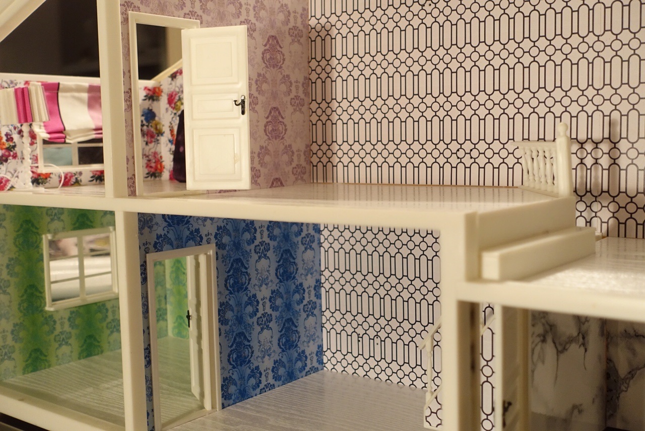 Jag var bara tvungen att kasta mig över dockhuset när jag kom hem i dag. Nu har jag lagt alla golv med vit trästruktur. Tapetserat alla väggar och kaklat badrummet och golvet….var bara tvungen att bara sätta ihop huset lite hjälpligt för att se resultatet.