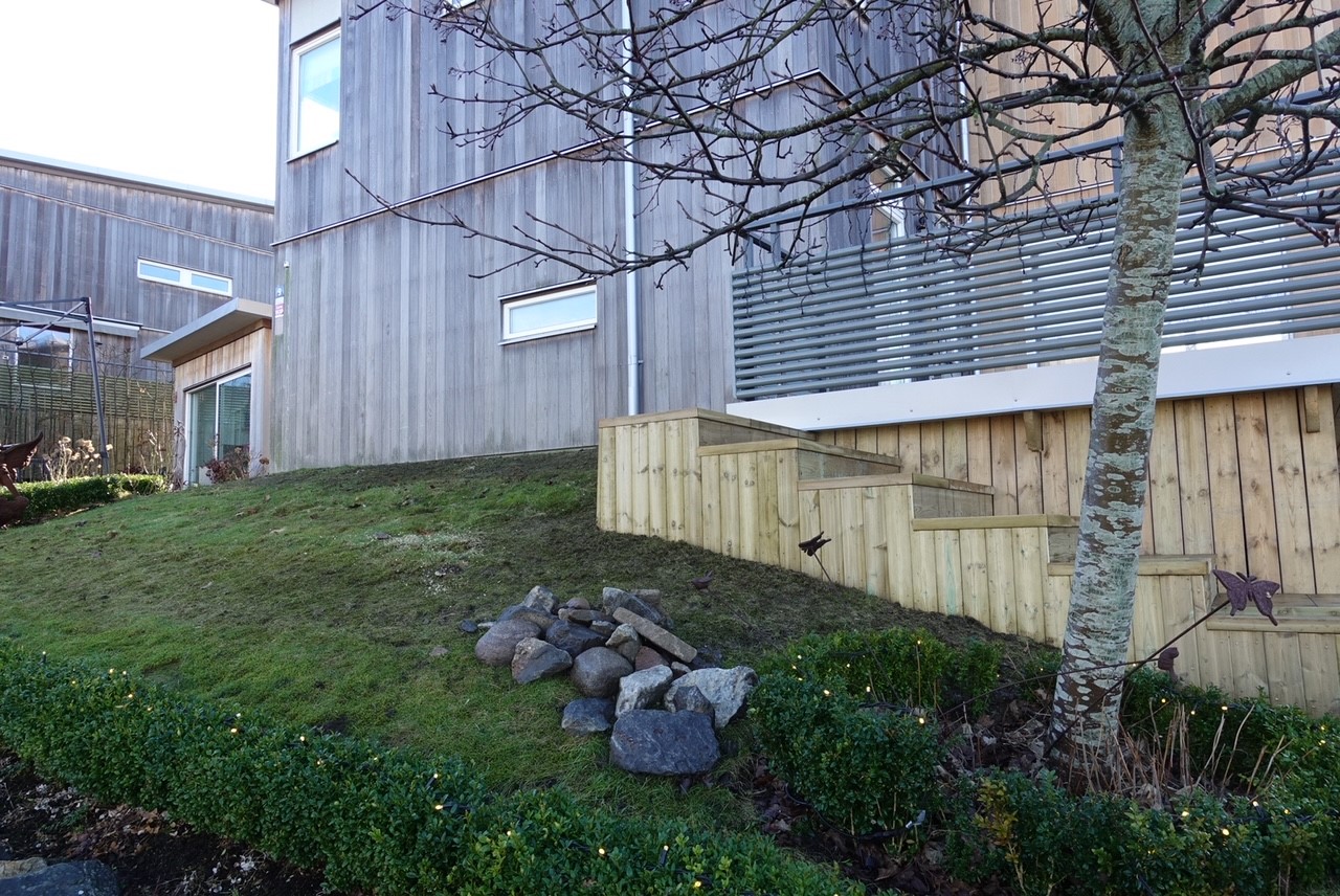 När det blir lite varmare ute skall Stefan sedan fortsätta bygga en spång längs hela kortsidan på huset. Det skall bli en terrassering med trappor och odlingslåder ner mot slänten. Sedan blir det några träd, buskar och blommor som skall planteras när våren kommer!