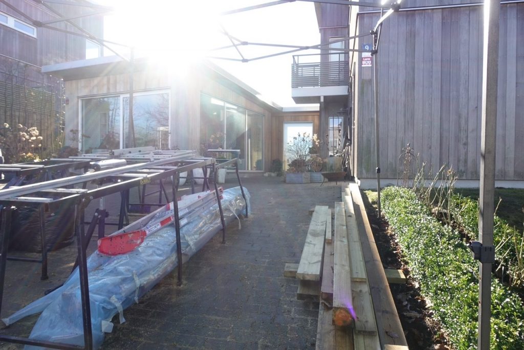 I dag gjorde vi nästa pass, att köra vår egna byggnadsställningar till lagret. Sedan plocka upp alla småbitar och sortera i säckar med cederträ, tryckt virke, vanligt trä, plåt och plast i påsar för att sedan köra ytterligare minst en gång till återvinningen.