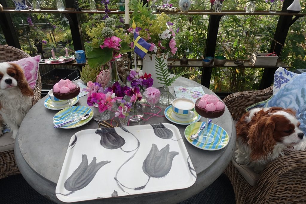 När vi planerade vårt orangeri så ville jag ha en mysplats i orangeriet. Vi planerade att det bara skulle vara två platser. Eftersom huvudpart av tiden så är det bara vi två. Det har blivit så fantastiskt och hundnarna älskar när vi skall fika eller äta middag. Vi gör det både på vår, sommar, höst och vinter. Eftersom det är uppvärmt kan vi sitta där närsom helst. Att tända alla ljus i både kristallkronan och lampetter gör det extra mysigt.