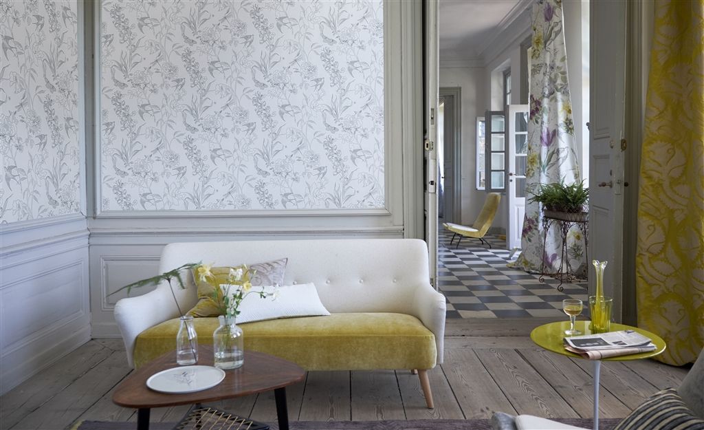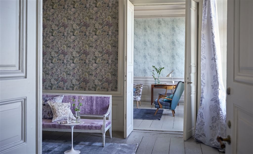 Se så vackert soffan med sitt lila tyger tar upp det lila i tapeten bakom och förstärker färgen i tapeten!