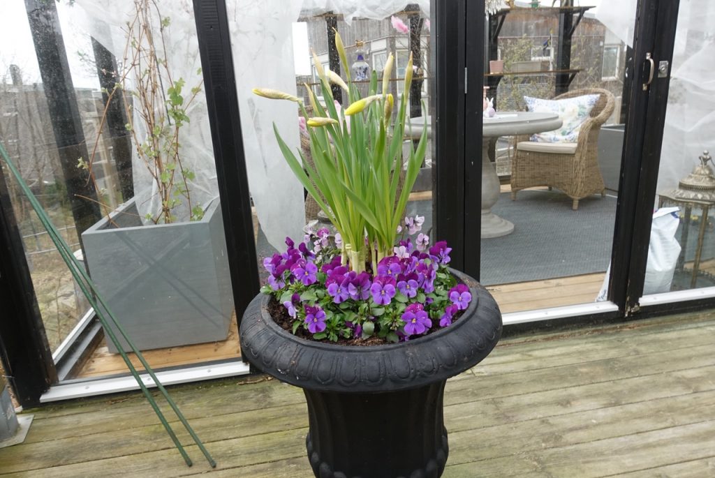 Jag blir så himla glad när jag tittar ut mot mitt orangeri och ser urnorna med Påskliljor och Penséer. Det ser så härligt ut med lite färg i en annars ganska grå miljö!