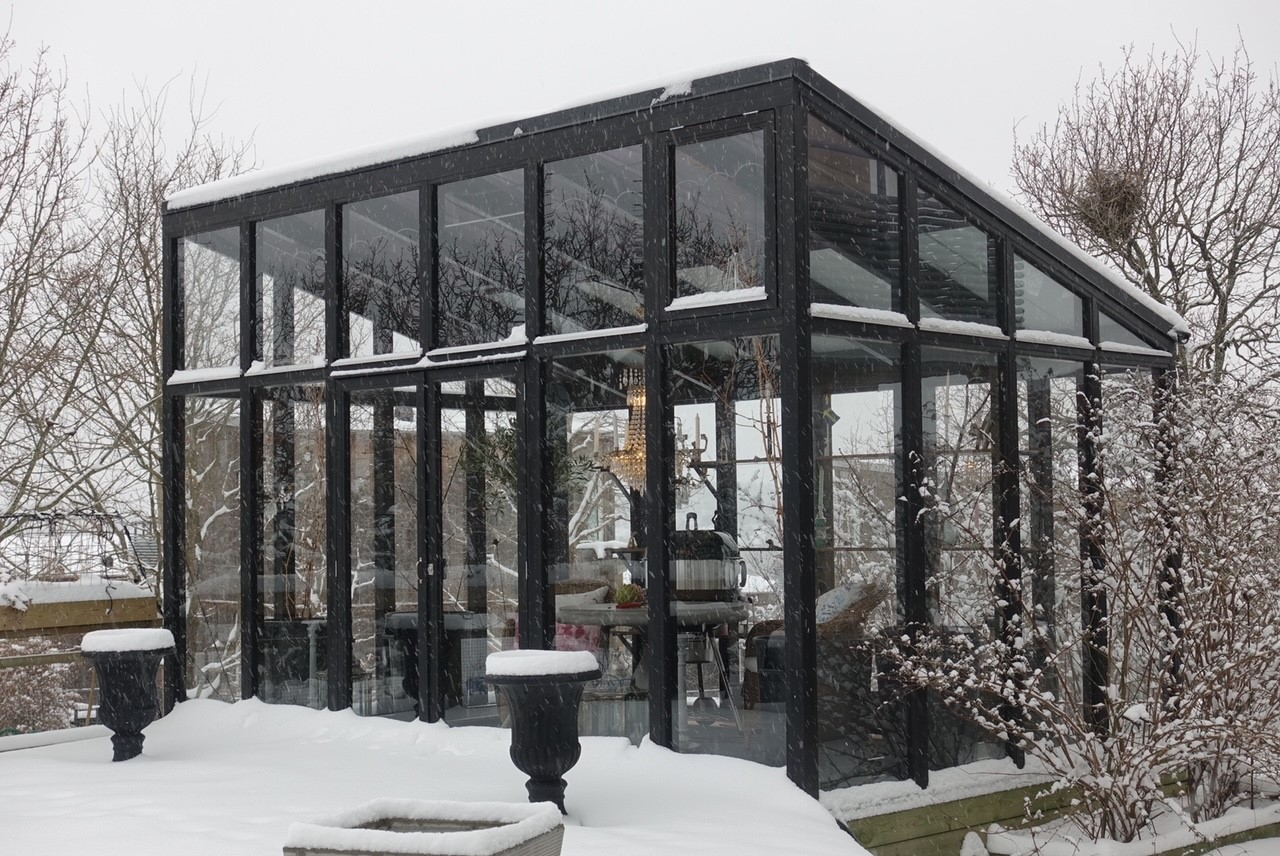 I orangeriet lyser kristallkronan och mitt Olivträd ser ut att verkligen må gott i orangeriet med maximalt ljus och frostfritt! När det är så här vackert så längtar man inte lika starkt till vår och sommar!