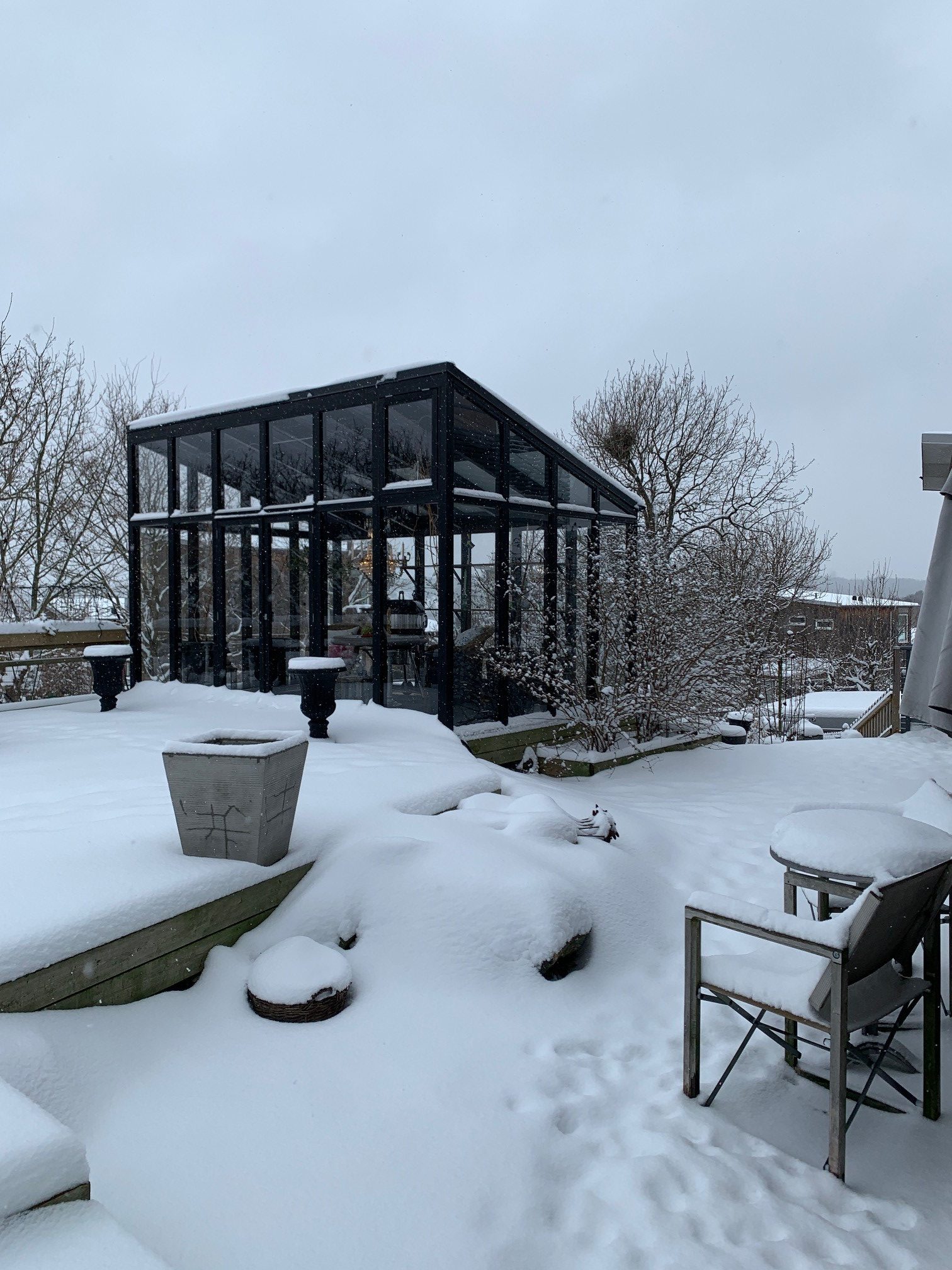 Här vaknar jag till ett snörikt landskap. Lite mysigt att sitta på insidan och se snöflingorna singla ner från himlen. Våra nya terrasser är täckta av vit snö och vi har fortfarande kvar granen på utsidan med belysning. Det ser så vackert ut.