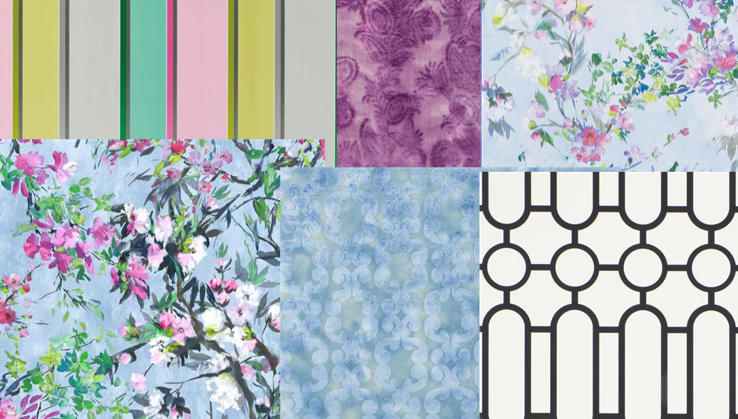 Det bredrandiga tyget längst upp till vänster är ett sidentyg och det är det jag tänkt att sy hissgardiner med mörkläggningstyg av! Det blommiga somriga tyget längst ner till vänster är ett tyg i 100% bomull och mönstret är bedårade! Vad tycker ni? Längst till höger ser ni två tapeter, en med ett geometriskt monster och en med ett blommig som går i stil med gardintyget och det två mellersta tygerna är skuren sammet som är tänkta som längder och kuddar. Detta är bara ett första litet utskast! Vad tycer ni?