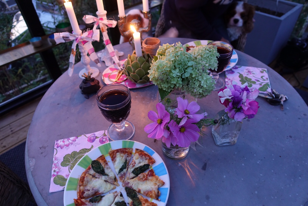 Jag lagade hemmagjorda Italienska pizzor och så drack vi Cola Zero till för att vara lite extra busiga! Vovvarna älskar att vara i orangeriet och både Fonzen och Boss sätter sig gärna och sätter upp tassen på dörren när vi släpper ut dom för att säga att att dom dom ville gå in där! Dom vet att det är ett ställe för mys!