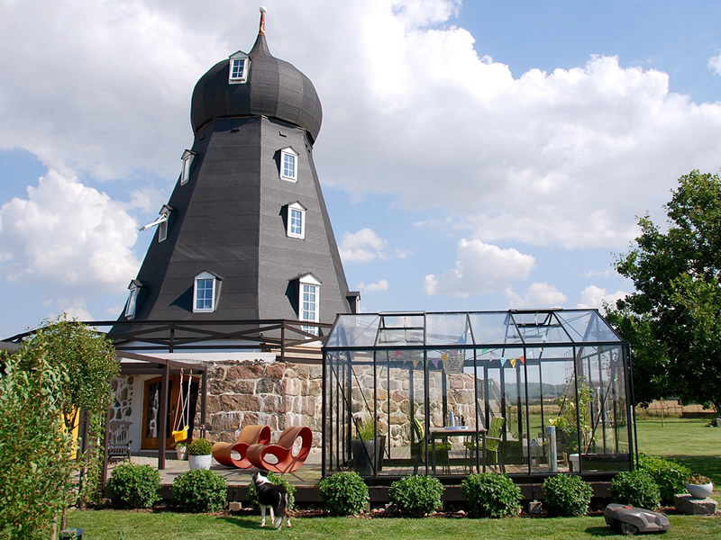 Jag älskar kontraster, och fullkomligt älskar bilden nedan med en väderkvarn och ett växthus!