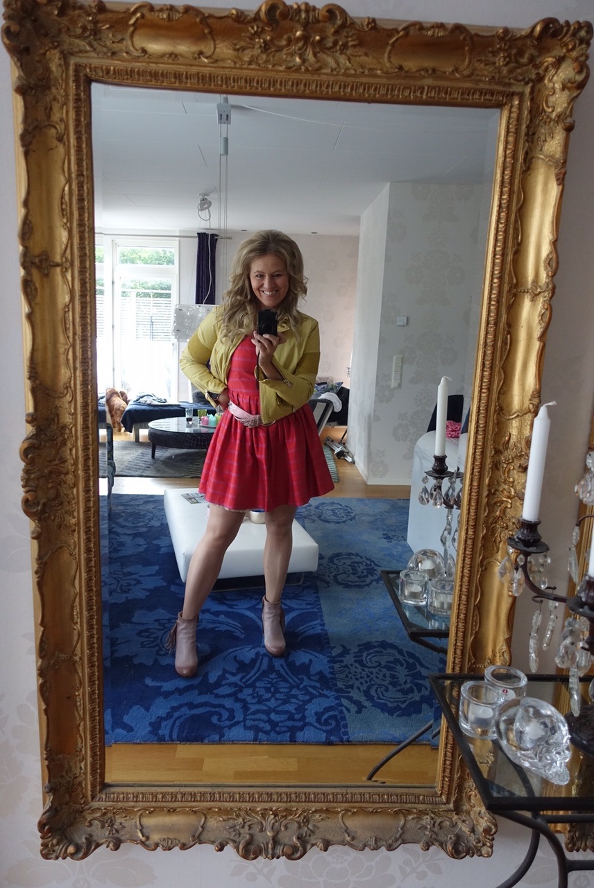 Valde en Pernillla Wahlgren Collection klänning som är röd med rosa ränder, och tog ett rosa läderskärp med nitar till för att förstärka färgen på skorna!