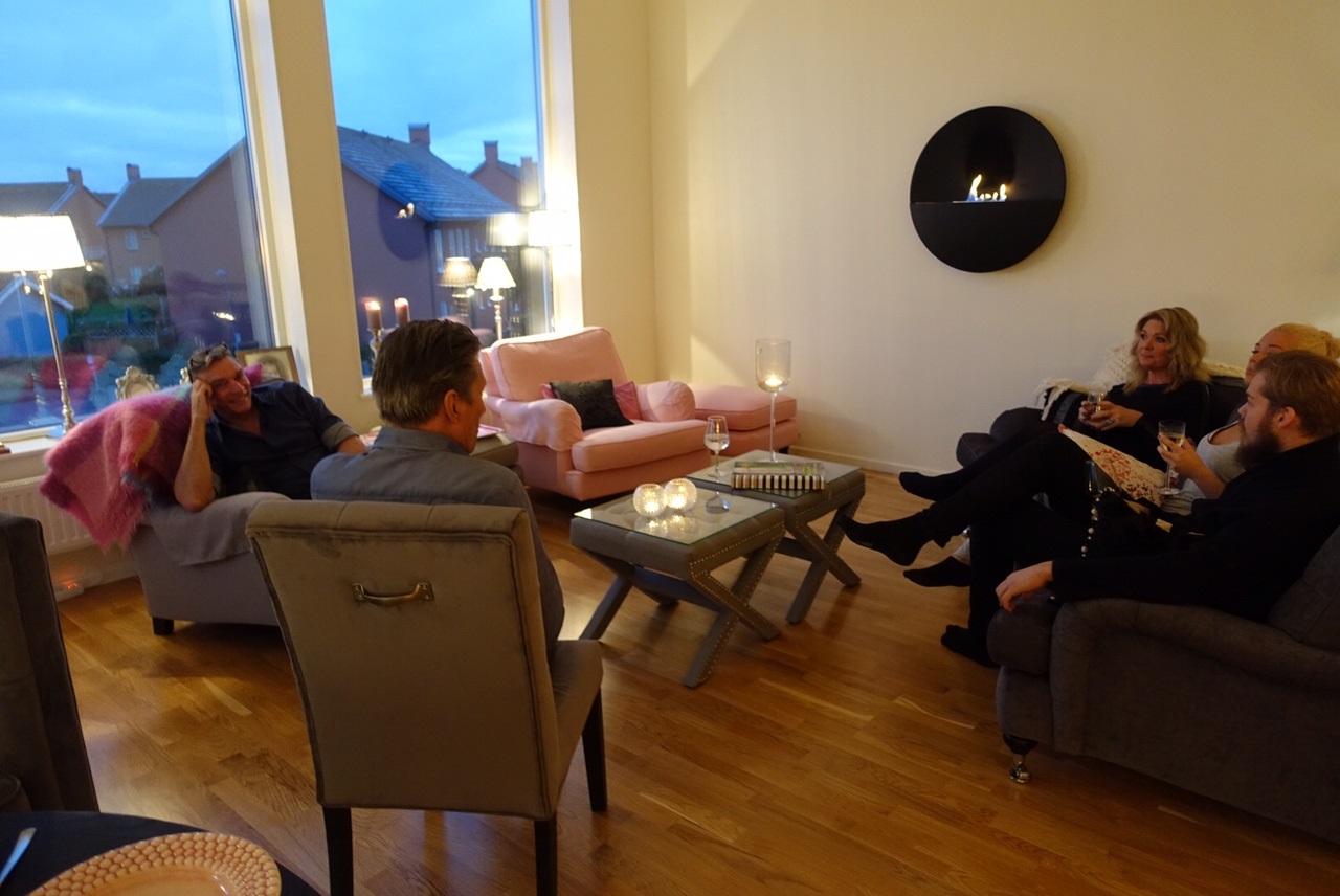 Här sitter alla och minglar och har roligt precis innan maten. Roger sitter i fåtöljen och ler, inte kan man tro att han är 52 år! Jag är så himla glad att min älskade väninna har hittat en sådan underbar kille! Dom är verkligen som klippta och skurna för varandra! Man blir på riktigt glad när man ser dom tillsammans! Det känns så härligt att se henne så himla glad igen. Gladare än hon varit på väldigt många år!