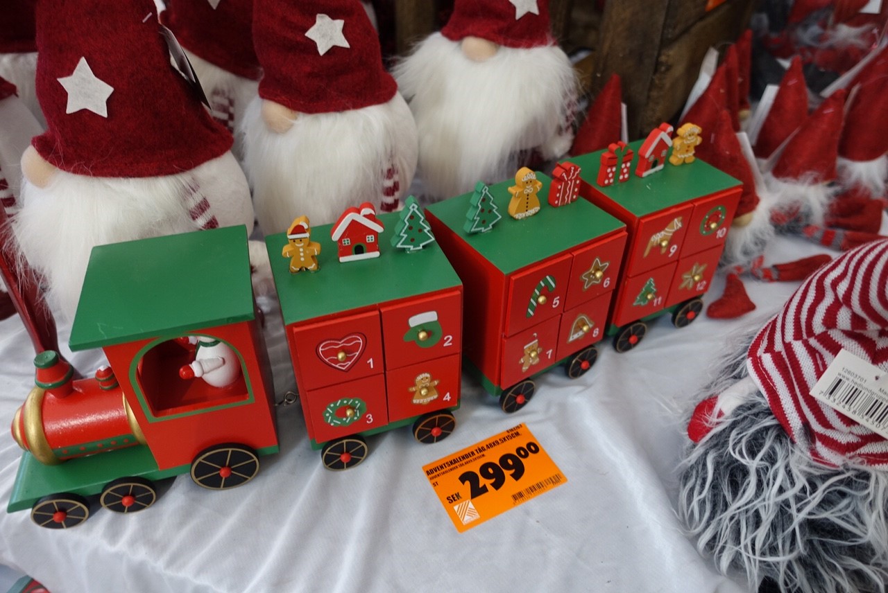 Sist men inte minst som jag inte kunde motstå med min lite barnsliga läggning för pynt och roliga saker…detta underbara lilla tåg med lådor på båda sidor i vagnarna och 24 stycken små möjligheter att lägga ner små presenter!