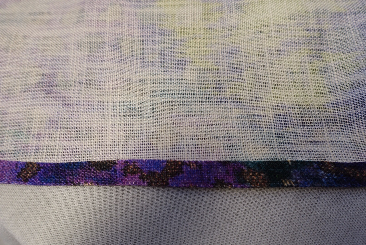 Det första man börjar med är att som alltid klippa bort det som kallas stadkant. Anledningen till att man alltid klipper bort den är för att den är oftast lite hårdare vävd och träden längs ut tenderar till att bli hårdare dragen och därför blir det inte bra om man behåller den och försöker fålla för då får man inte en rak kant. Så man skall alltid klippa bort stadkanten på alla tyger.