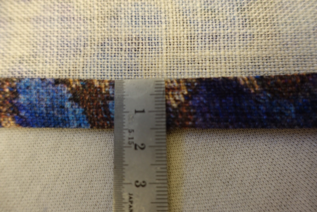 Först tillse att du har rätt sida upp på tyget och lägg avigsidan upp på strykbrädan och stryk in 1,5 centimenter av tyget längs hela kortsidan i ovankant. Därefter tar du en tumstock eller en mätsticka och viker ner tyget 13 centimenter. Var säker på att det blir exakt 13 centimeter och mät också efter att du strukit tyget. Här är det viktigt på milimetern för om du inte gör det noggrant här bli gardinen sne. Nåla vartefter du strukit ber kanten.