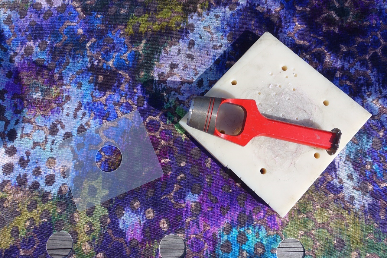 Öljetterna måste sitta exakt 5 cenitmeter från ytterkanten om man gör med 8 st öljetter, detta för att det skall se snyggt ut från sidan när man sätter upp gardinen. Man måste även ha några centimeter till ovankant för att det skall bli snyggt, och jag väljer att göra mina hål 3,5 centimeter nedanför ovankant. Själv har jag gjort en mall eftersom jag gör det så pass ofta. Man mäter ut först de två yttersta och sedan beräknar man var de återståede 6 öljetterna skall sitta för att alla skall vara på samma avstånd. Slagverktyget kan man köpa i en välsorterad sömnadsbutik. Själv har jag ett proffsverktyg som går att slipa och det behövs då och då.