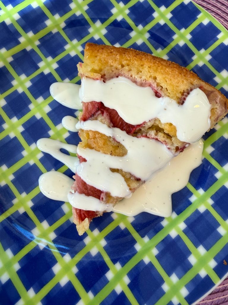 Grädda i mitten av ugnen i ca 38-45 minuter. När du tar ut kakan skall den ha fått lite färg och mitten kan fortfarande vara lite lös men inte för mycket. Låt svalna. Perfekt att ha i kylen och jag brukar servera med vaniljsås.