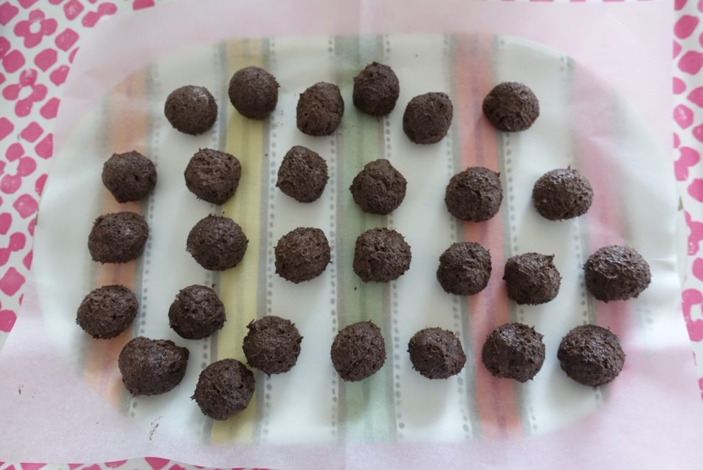 När smeten är klar och är jämn och fin så ställer du in smeten i kylen i cirka en timma. Detta för att den skall bli lite hårdare och då blir det lättare att rulla till bollar. Jag brukar få ut ca 25 stycken.
