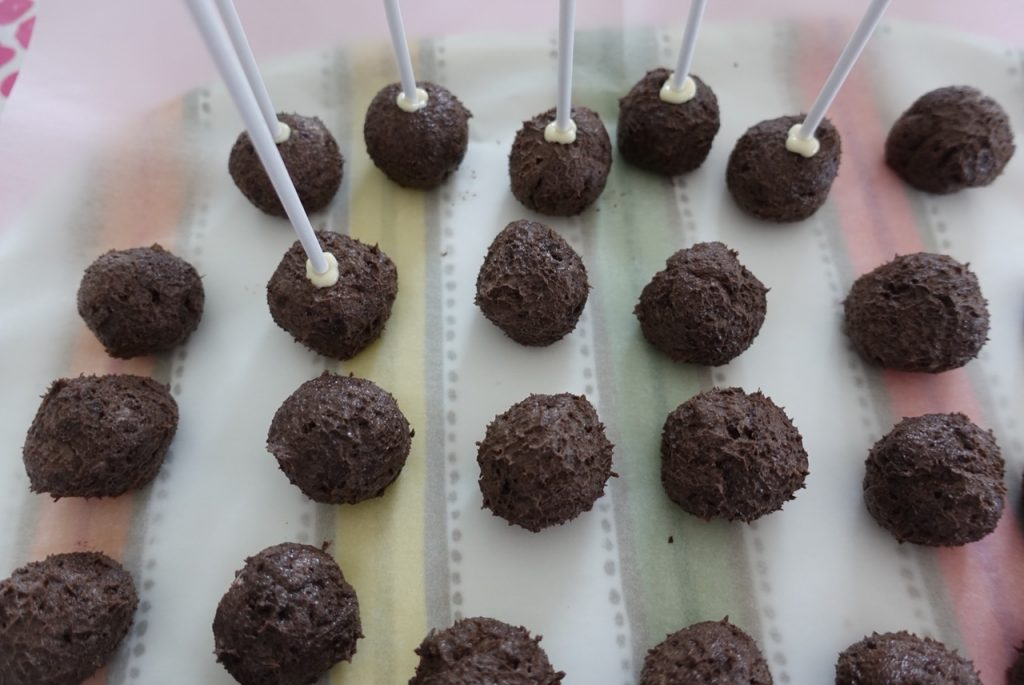 Sedan är det dags att fästa pinnarna. Smält 50 gram vit choklad i microvågsugnen, och doppa pinnarna i chokladen innan du sticker ner den i Cake Popsen. På så sätt sitter pinnen fast ordentligt och lossnar inte när sedan gästerna skall serveras.