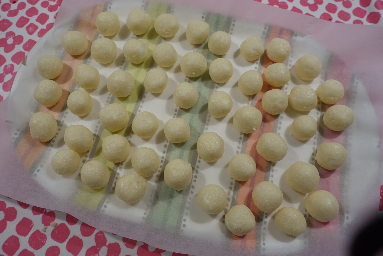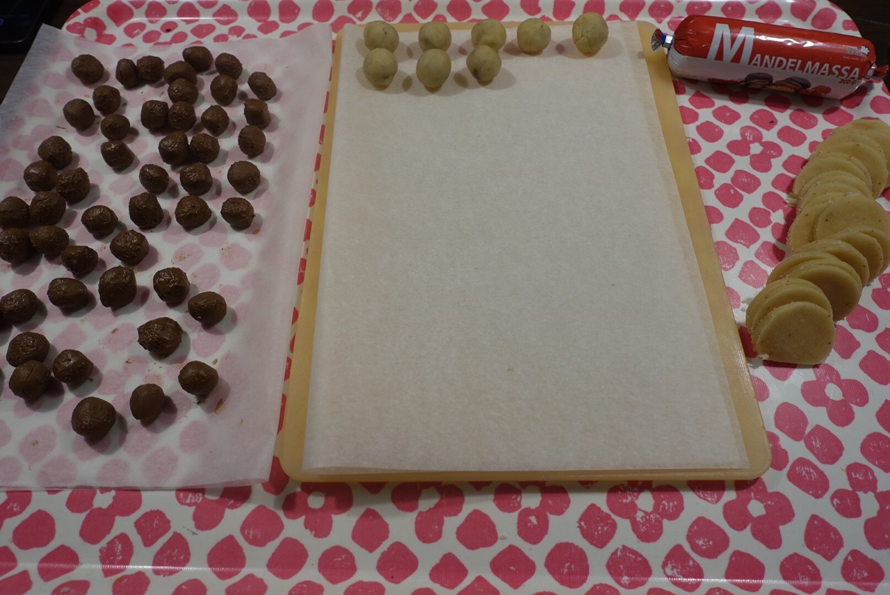 Jag har rullat 51 stycken Bounty som jag skjutsat in i frysen så att jag kan doppa dom i choklad i morgon! Jag har även rullat mina Mozartkulor i mandelmassa och satt dem i kylen så att det blir riktigt kalla för att även dom doppas i choklad i morgon.