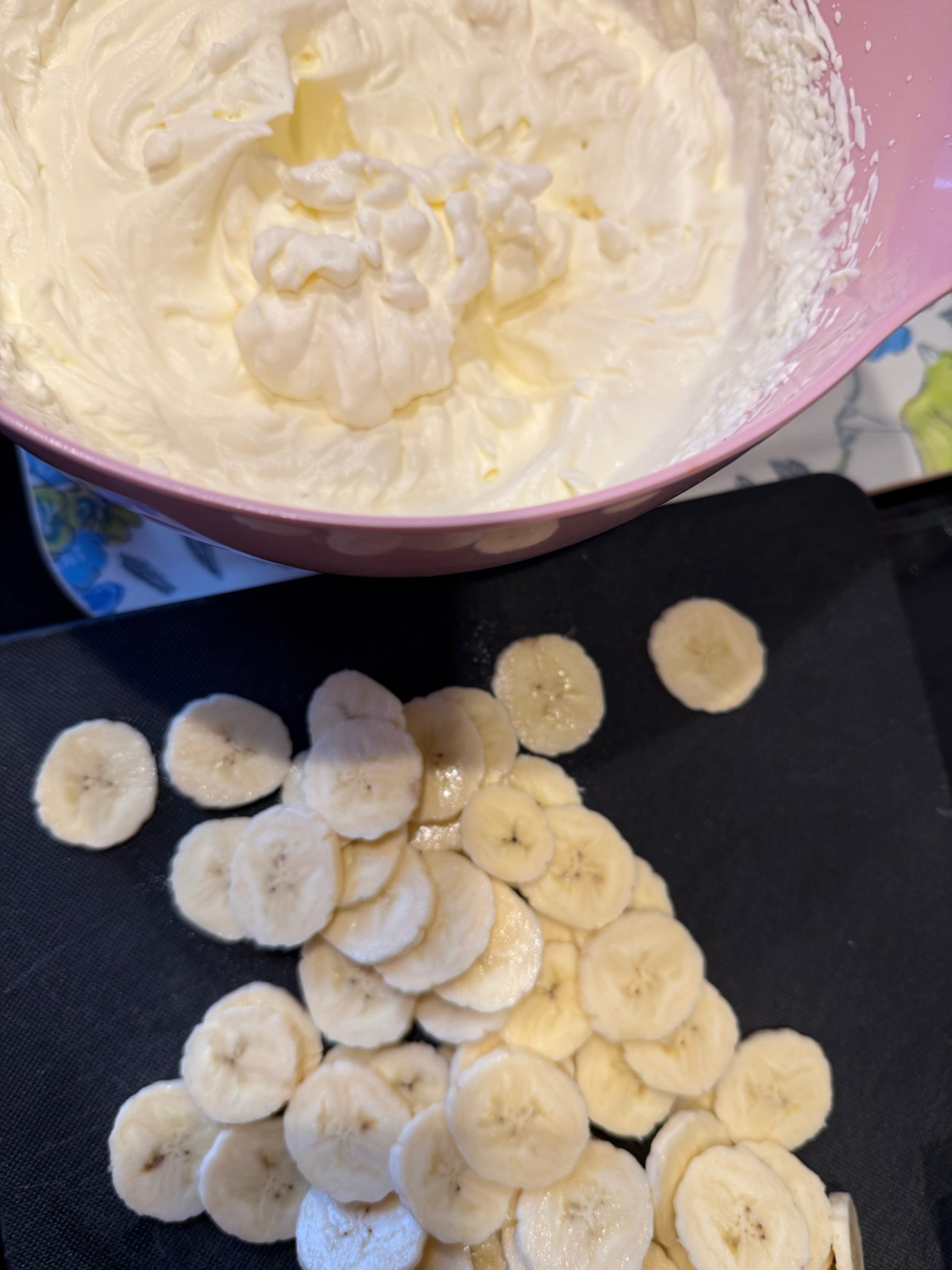 Börja med att vispa grädden. Skiva därefter alla bananer.