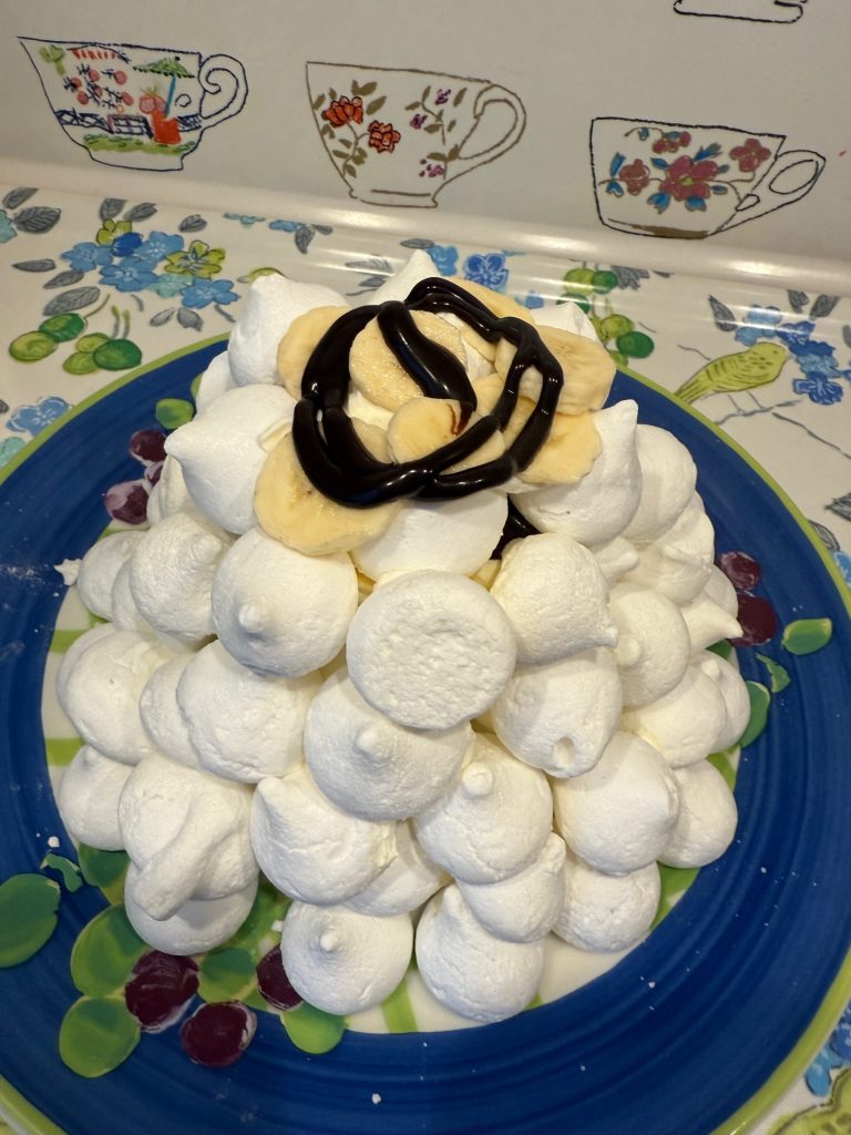 Jag gör alltid min Marängsviss som en pyramid. Se till att chokladsåsen stått i kylen så att den är lite kall. Det gör att den inte rinner så mycket. Jag börjar att lägga maränger på hela tallriken i en rund ring. Därefter lägger jag cirka 1-2 matskedar grädde i mitten på den runda ringen, några bananskivor och sedan ringlar jag lite chokladsås som fungerar lite som klister. Därefter börjar jag med nästa lager och gör likadant på varje lager tills jag når toppen. Jag lägger bara grädde precis i mitten och jag försöker inte smeta ut den på varje lager.