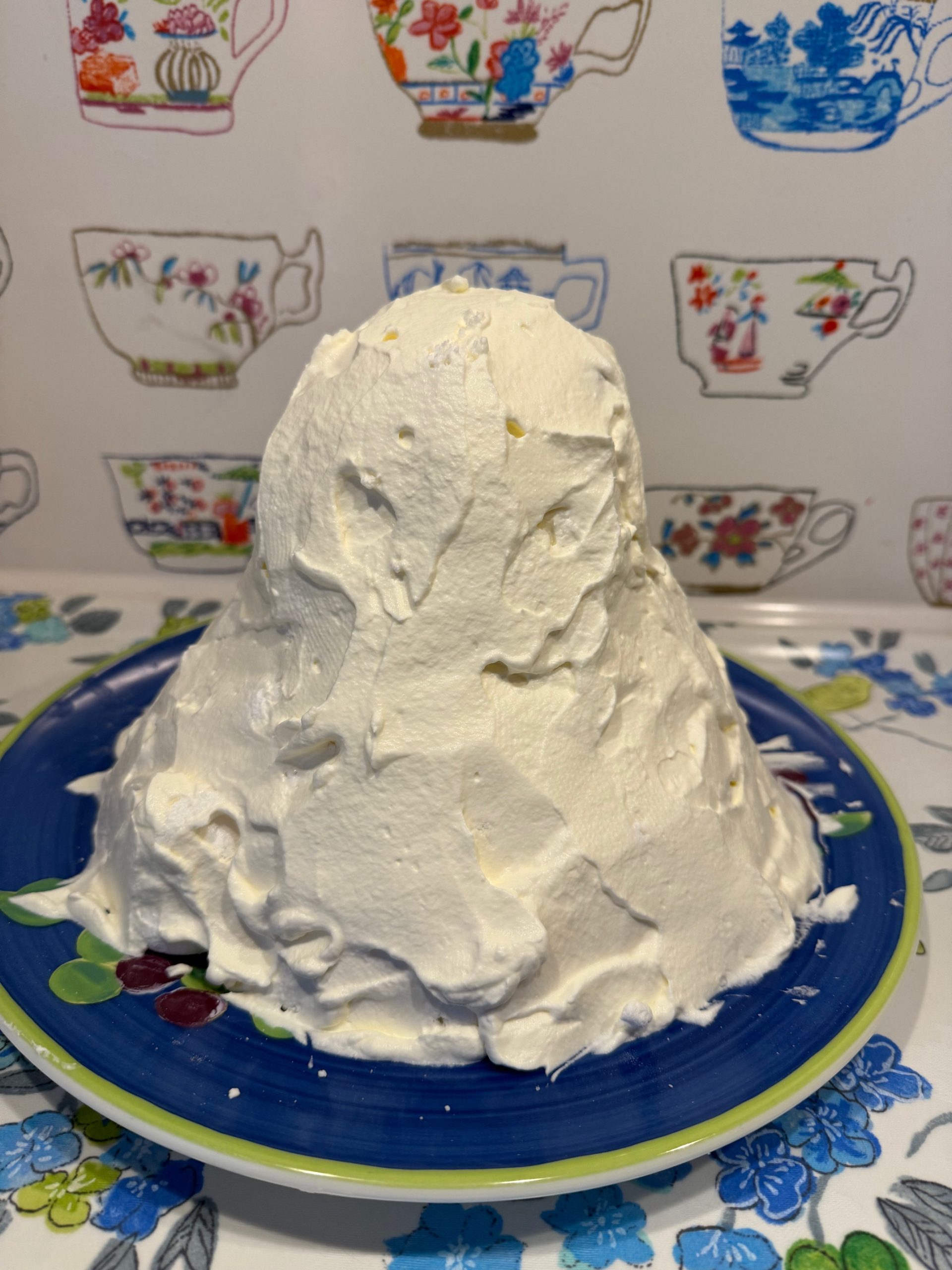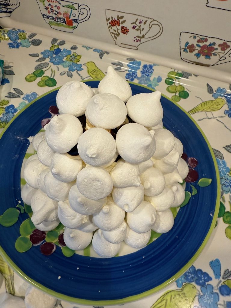 Man gör grunden så stor man vill ha den och beroende på hur många man är, och sedan bygger man marängsvissen som en pyramid. Jag vill poängtera att man behöver inte lägga mer grädde än 1-2 matskedar i mitten. Slutligen så täcker man hela pyramiden i grädde.