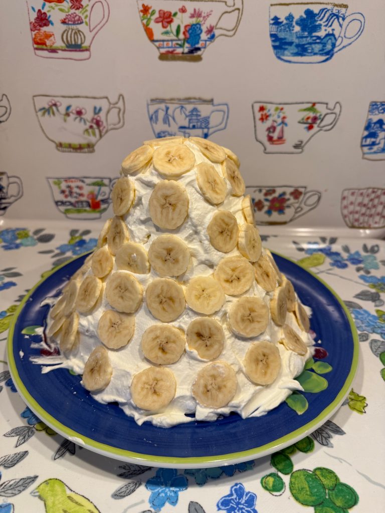 Så på varje lager lägger jag lite grädde i mitten, några banaskivor och ringar chokladsås ovanpå. Sedan börjar jag med nästa lager och gör likadant hela vägen upp.