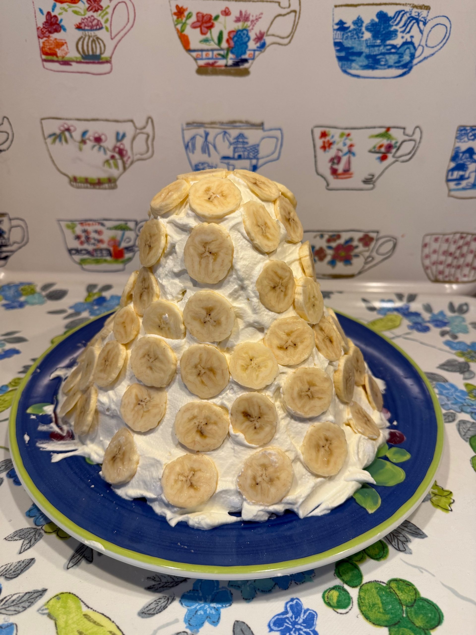 När jag dekorerat med alla bananer över hela tornet så börjar jag ringla chokladsås från toppen och ner till grunden! När den är klar så ser den ut så här!