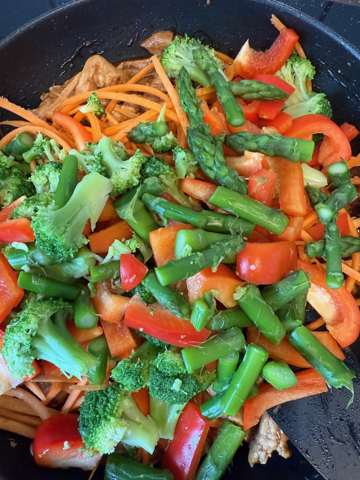 Koka sparris och broccoli var för sig så att dom inte är riktigt färdigkokta (dom kommer bli det när dom läggs i såsen). Hacka paprika, morot, och sparris i mindre bitar. Skär även broccolin i mindre bitar.