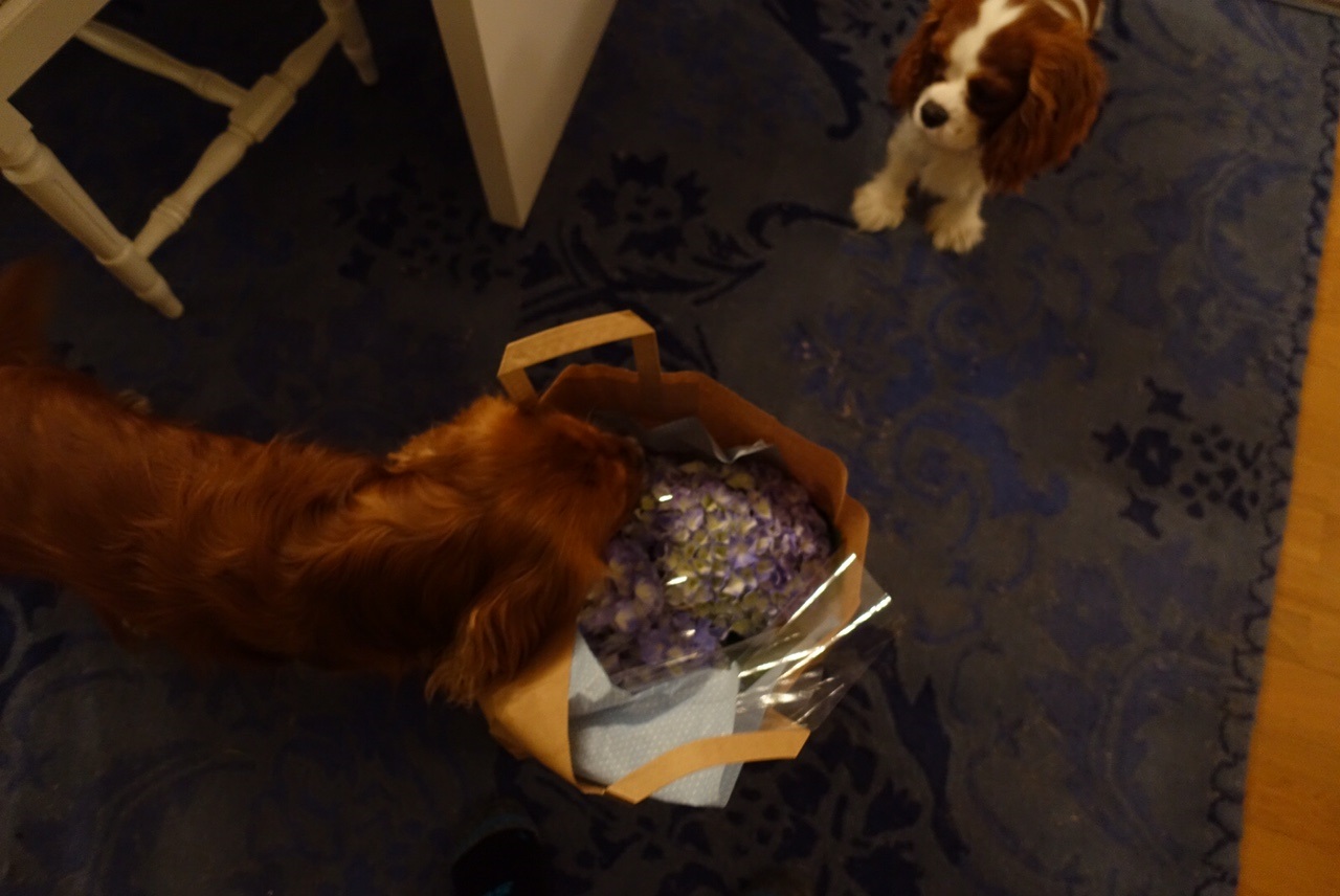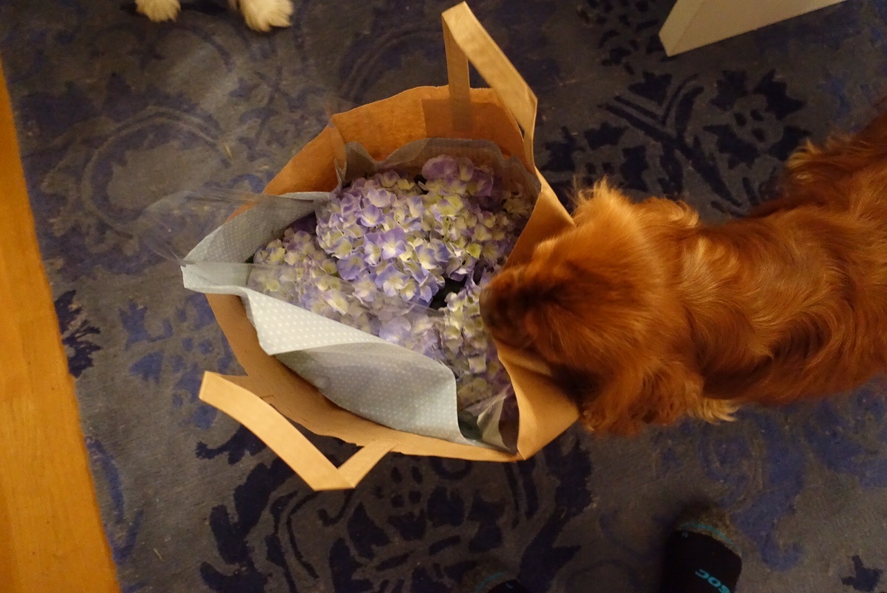 Efter middagen skulle jag packa upp min vackra Hortensia och några ville vara med!