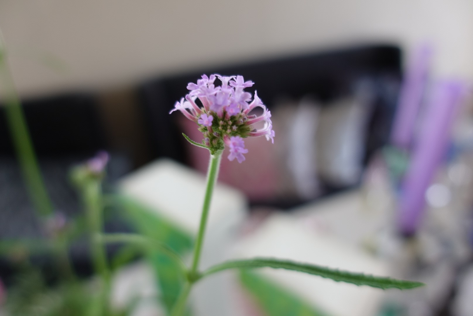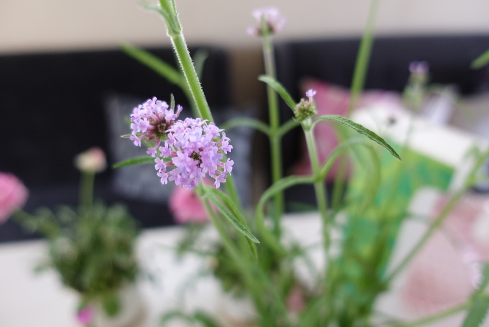 Jag älskar att omge mig med snittblommor. Redan nu har jag en hel vas med Jätteverbena som jag drivit upp på egen hand. 15 plantor som står och växer till sig. Varenda frö jag satte tog sig! Helt fantatiskt. Blommorna klippte jag av för att låta växten utveckla sig och på köpet fick jag snittblommor.