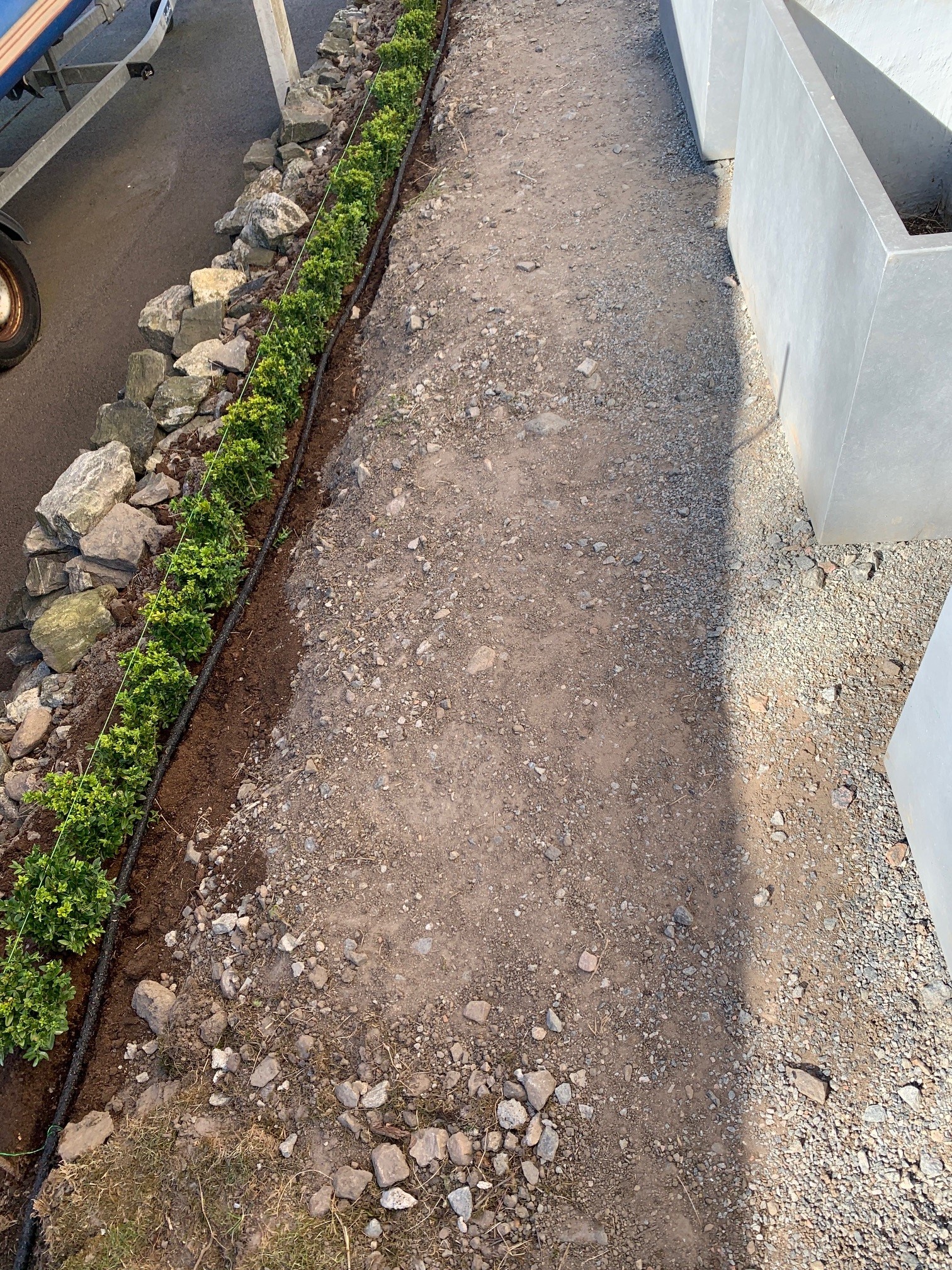 Hem » Buxbomsklot satta i trappan! » Bevattningsslang på plats och inkopplad
