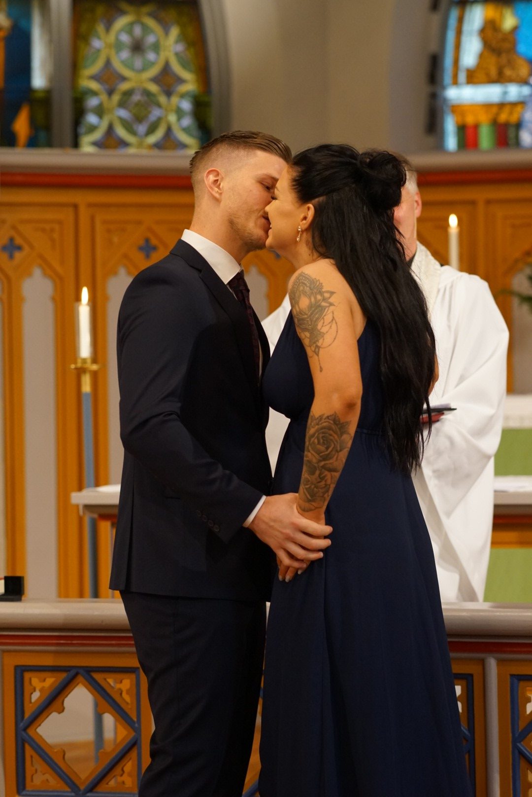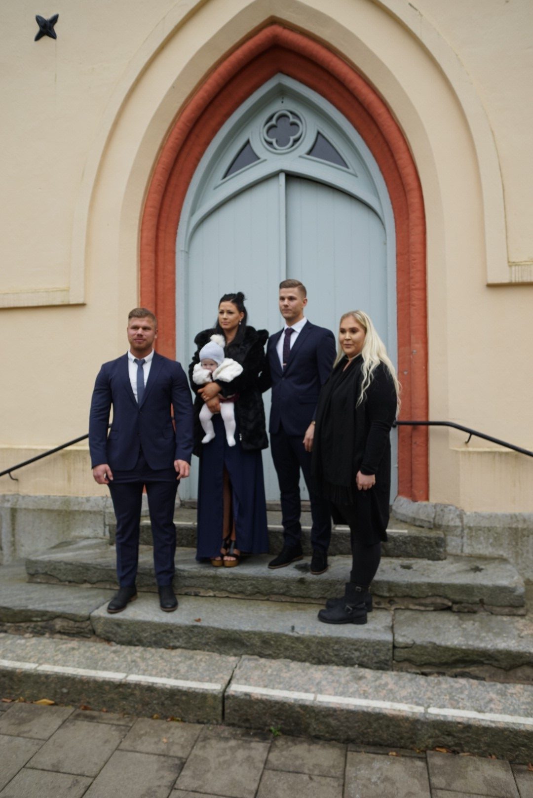Tänk att komma till ett dop och när sista versen är sjungen på ”Tryggare kan ingen vara” så dundrar det i gång med bröllopsmarschen. Erika som var så vacker i sitt långa vackra hår med fin klänning, och Christoffer i kostym med slips! Matchade varandra både till klädsel och utseende. Vackrare par får man leta efter, och sedan denna lilla prinsessa på toppen av detta. En liten underbar varesle som man bara vill ta med sig hem, Leonore Izabelle Holmberg, och nu heter dom alla Holmberg i efternamn.